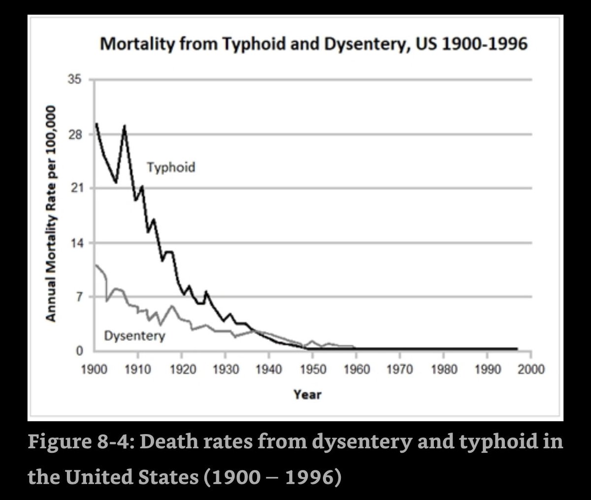 Other infectious diseases whose mortality declined steeply in this era include typhoid, whose death rate dropped by close to 80%; scarlet fever, which also decreased by about 80%; and the bowel diseases dysentery and cholera, whose mortality had cumulatively dropped by approximately 30%. Again all before a vaccine was in widespread use.