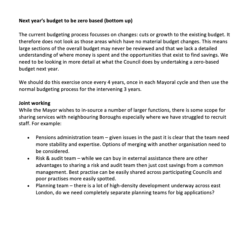 + zero based bottom-up budget as the Council needs to look at the detail of what it does (budget process just looks at change)