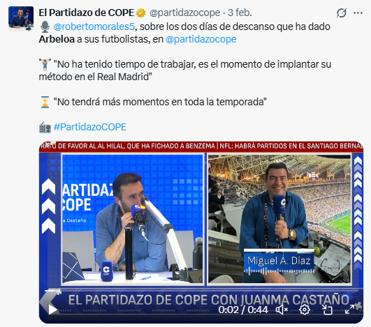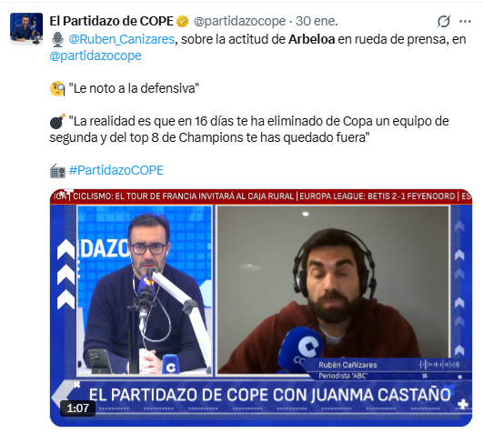 la consigna (en la imagen, el de ABC soltando su mierda en la COPE). ¿No os huele esta campaña sincronizada a venganza contra el entrenador del Real Madrid por ponerles en su sitio en las ruedas de prensa? A lo que me suena a mí es a estrategia de Arbeloa para aliviar la presión