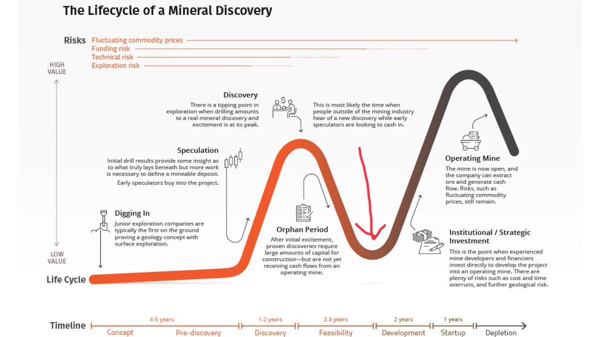 In my opinion, most uranium developers Are in the end of the orphan period(red Arrow). This period consist of a already discovered asset in the ground, wich are undergoing feasibility studies, permitting, enviromental assesment ect.