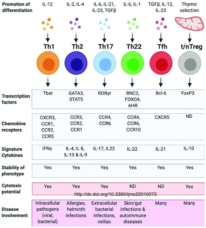 A estos diferentes comportamientos que puede tener un linfocito T CD4+ les llamamos subtipos (o subsets, en inglés). Son Th1, Th2, Th9, Th22, Th17, Treg, Thf, Tr1, Th3…