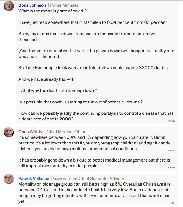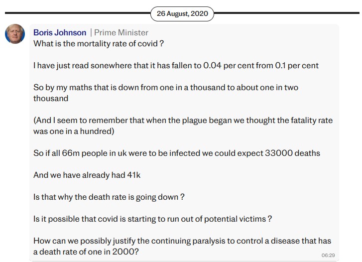 Based on his faulty maths, Johnson questioned “How can we possibly justify the continuing paralysis to control a disease that has a death rate of one in 2,000?”.