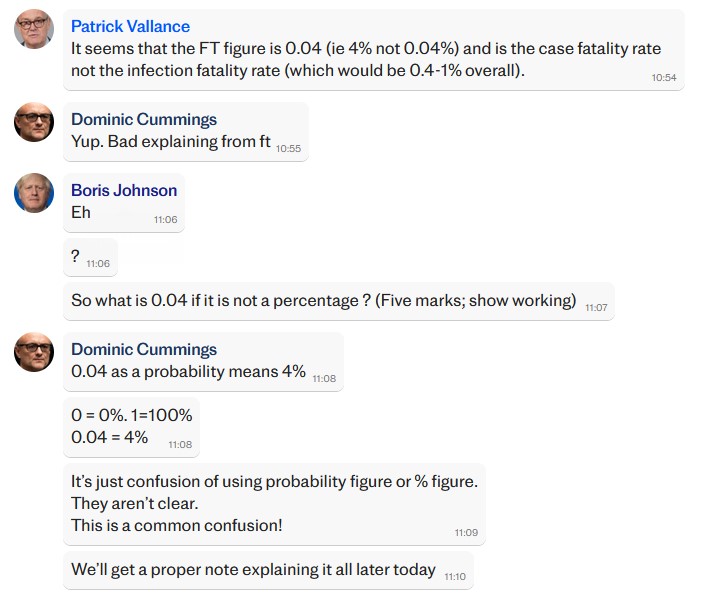 Patrick Vallance patiently explained this to Johnson: “It seems that the FT figure is 0.04 (ie four per cent, not 0.04 per cent)”. Johnson replied “Eh? So what is 0.04 if it is not a percentage?”