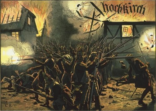 ...In this sorry state of affairs the Duke of Bevern came galloping up..."Children," yelled the Duke, "Shoot for God's sake, shoot and advance!" "Oh, dear father," the lads replied, "What shall we do?" We have no more powder, and are being shot dead without reply!"