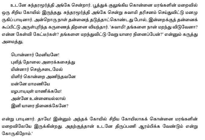 Once, when Sundaramoorthy Naayanar was on a yatra to Chola temples, he crossed a river & continued to walk near Mazhapaadi, an area covered by dense Konnai trees.