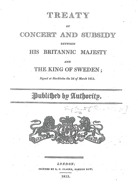 #OTD 3 March, 1813, the Treaty of Concert and Subsidy between His Britannic Majesty and the King of Sweden was signed in Stockholm. Stipulating an exchange of Sweden's military aid for territorial and financial compensation, it drew Bernadotte within the orbit of the Coalition.