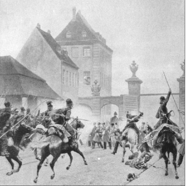 Around 9 o'clock in the morning, the Cossacks took notice of the open door. Having entirely been "on their heels" last night, they poured themselves into the city, and "brought back a good part of the stragglers as prisoners."