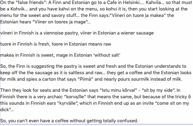 Not so well-known fact - before WW2, Estonia was RICHER than Finland. But then the Russians came and stayed for 50 years in Estonia. Finland stayed independent and was sort of a bridge to the Western world for occupied Estonia.