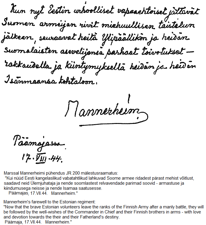 Estonian volunteers went to Finland to join the fight against the Soviet Union in the Continuation War in 1943. Finnish Field Marshal Mannerheim ordered the formation of Estonian volunteer regiment Infantry Regiment 200, which consisted of 1,973 Estonians and 361 Finns.