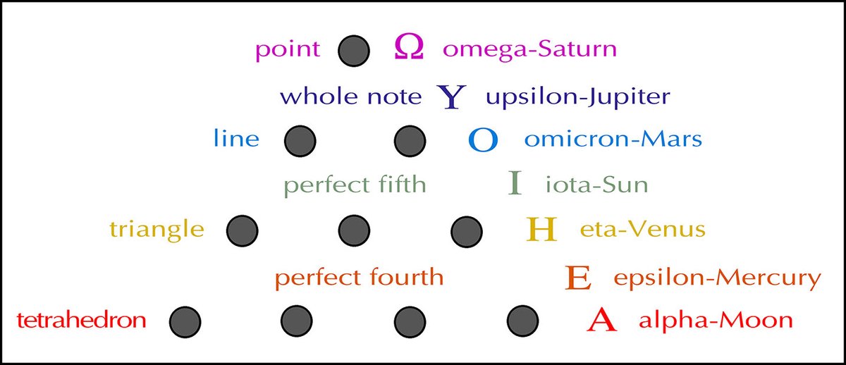 "The instrument is divided in half into an upper, active octave & a lower, material, passive octave, & these are in turn divided into fourths and fifths. On these intervals the upper, principle of light moves down into dark matter, & at the intersection the Sun the transformer."