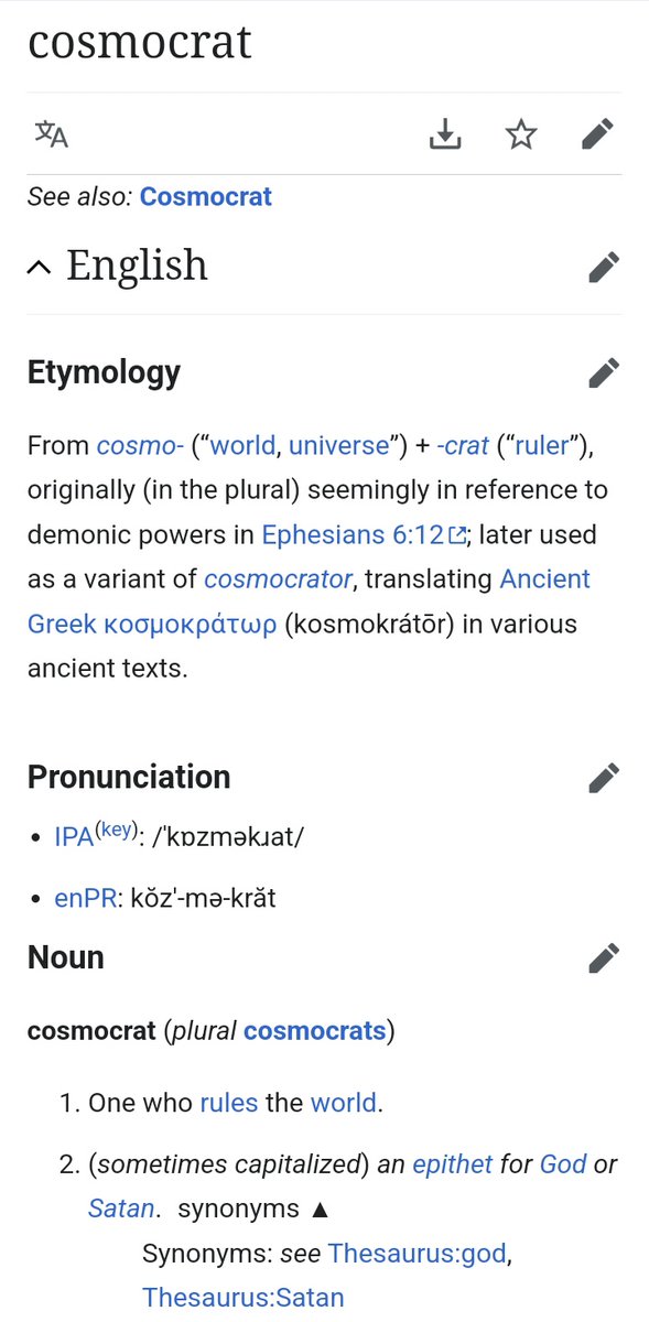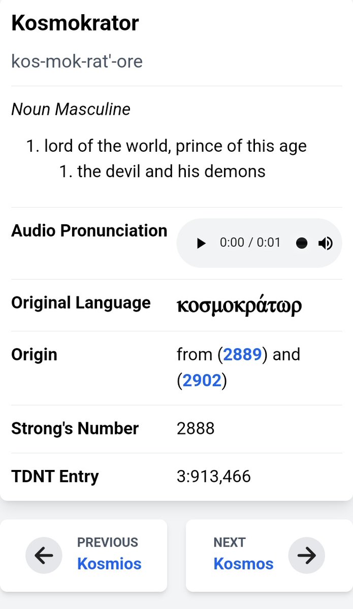 The Definition of 'Kosmocrator' is 'Lord of the World or Prince of this Age; the Devil and his Demons'.
