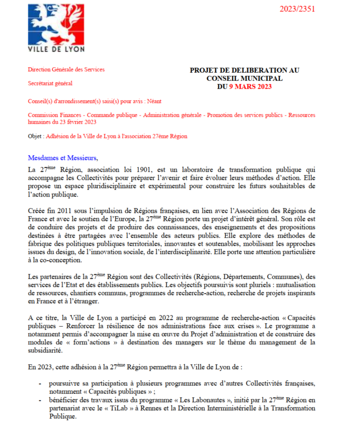 La Ville va adhérer l'asso "La 27ème Région" qui se veut "un laboratoire de transformation publique qui accompagne les Collectivités pour préparer l’avenir et faire évoluer leurs méthodes d’action".