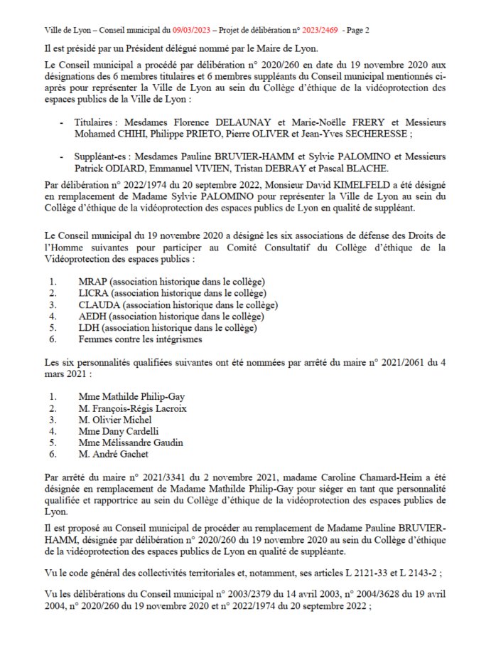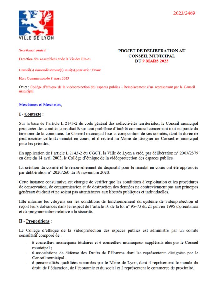 Passons aux délibérations. Vous vous souvenez de la mise en place du Collège d’éthique de la vidéoprotection des espaces publics ?