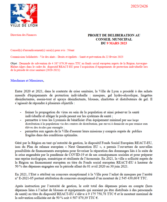 Vous vous rappelez du bazar pour l'achat de masques et autres matériels lors de la 1e crise du Covid par les collectivités ? La Ville va rétro-activement récupérer 4,5 M€ des sommes dépensées auprès d'un fond européen.
