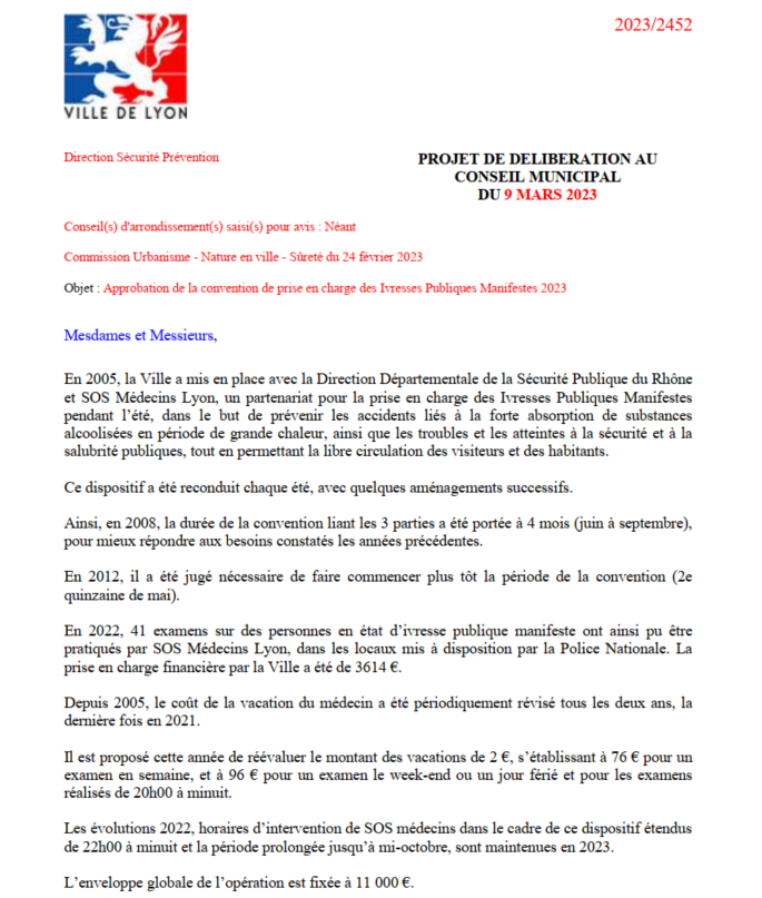 On en avait parlé lors d'une précédente présentation des délibs : l'ivresse publique a un coût, celui de leur prise en charge par les services publics afférents, notamment SOS Médecins Lyon. Il en coûtera 2€ de plus par vacation.