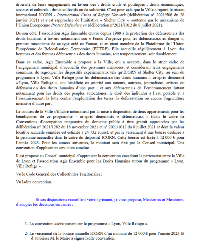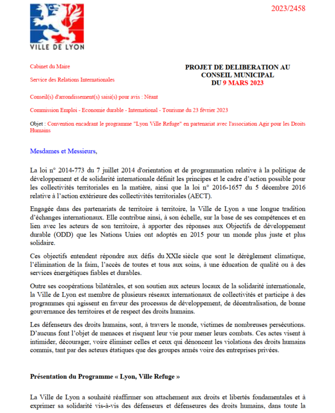 "Ville refuge", Lyon confirme aussi ses engagements envers les droits humains et l'accueil de réfugiés, notamment avec @AEDHmonde .