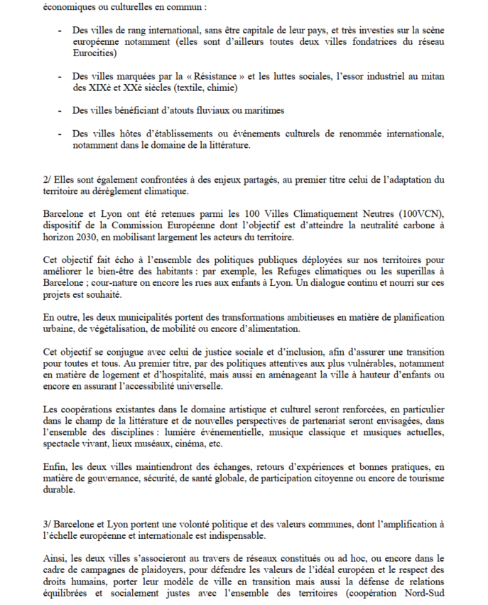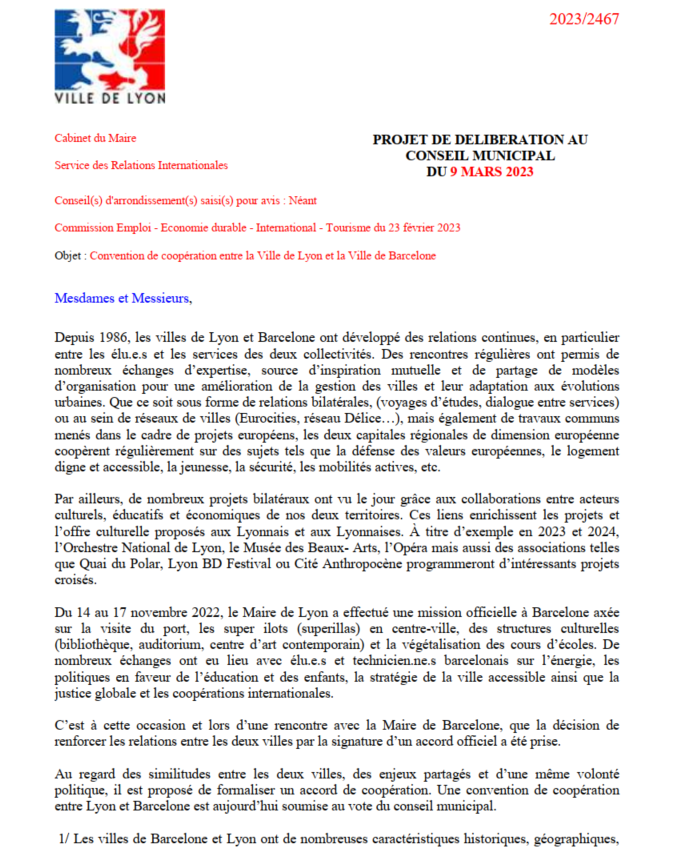 Lyon entérine aussi une convention de coopération avec la ville de Barcelone, au regard de nombreuses similitudes d'histoire et de préoccupations entre les deux villes.