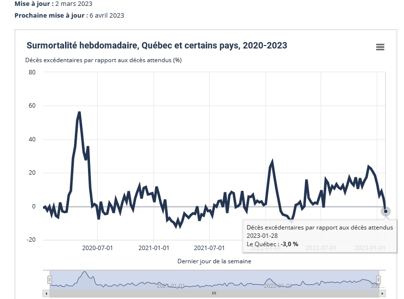3) On Jan. 22 last year, in the midst of the first #Omicron wave, excess deaths in Quebec soared by 26.2%. You will recall that intensive-care units were overflowing at the time, and this compelled Premier François Legault to declare a months-long curfew across the province.