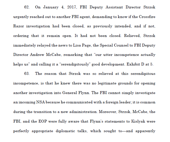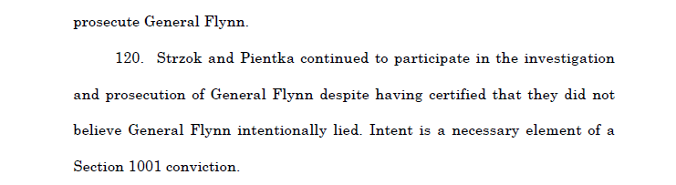 Strzok and Pientka continued prosecuting and investigating Flynn even though they had certified themselves that they didn't think he lied. Intentionality would have had to be a part of it if he did lie. None of that existed.