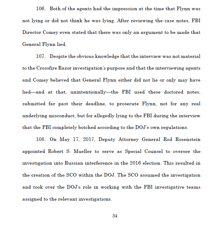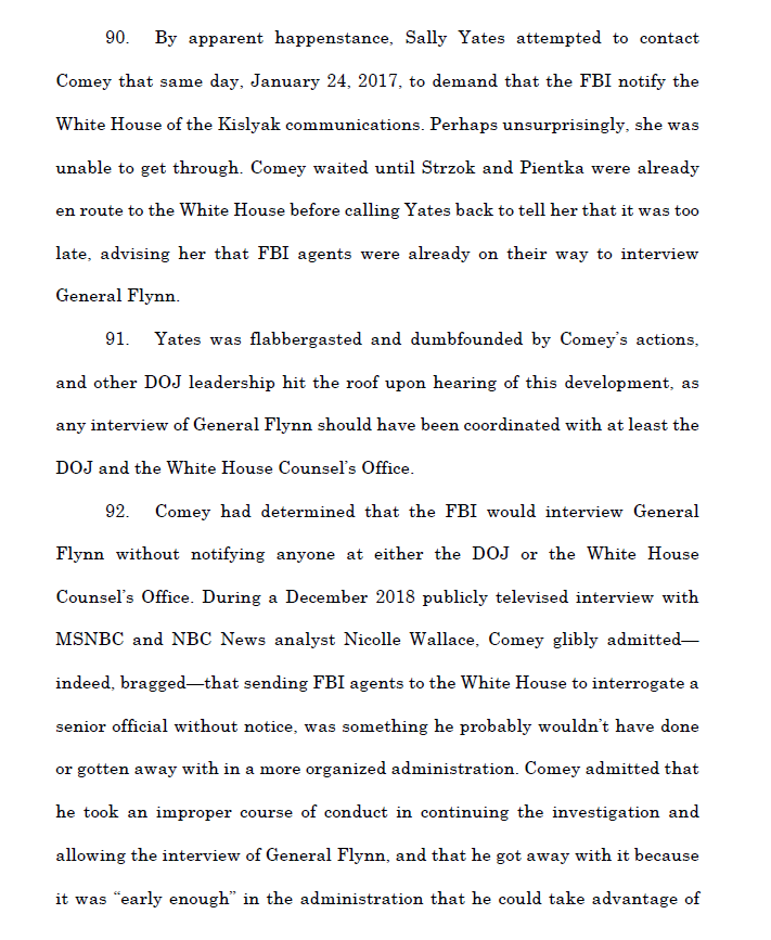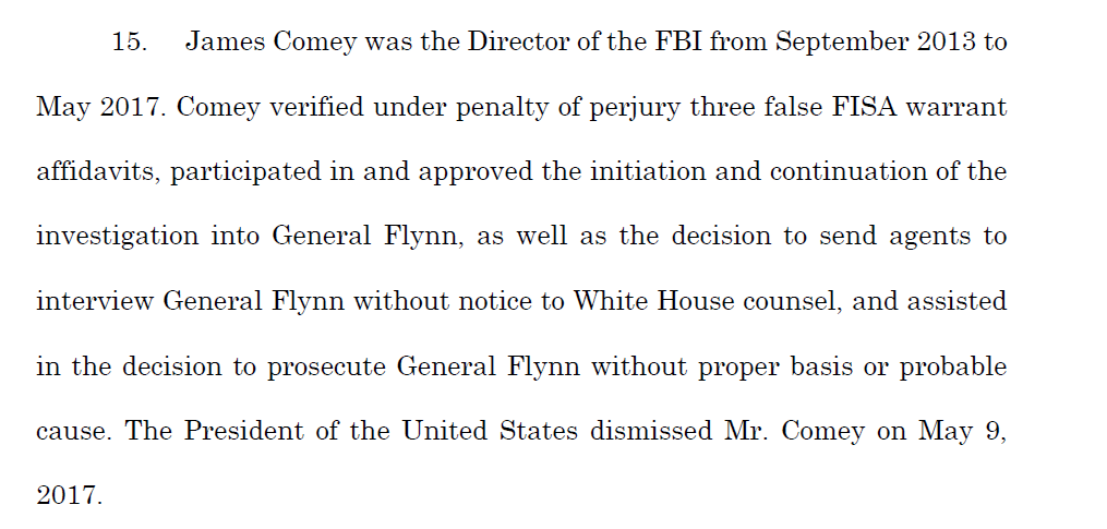 Comey verified under penalty of perjury 2 false FISA warrant affidavits, participated in and approved the initiation and continuation of the investigation into General Flynn, and the decision to send agents to interview him without notice to WH Counsel, and assisted in the decision to prosecute him without proper basis or probable cause to do so.