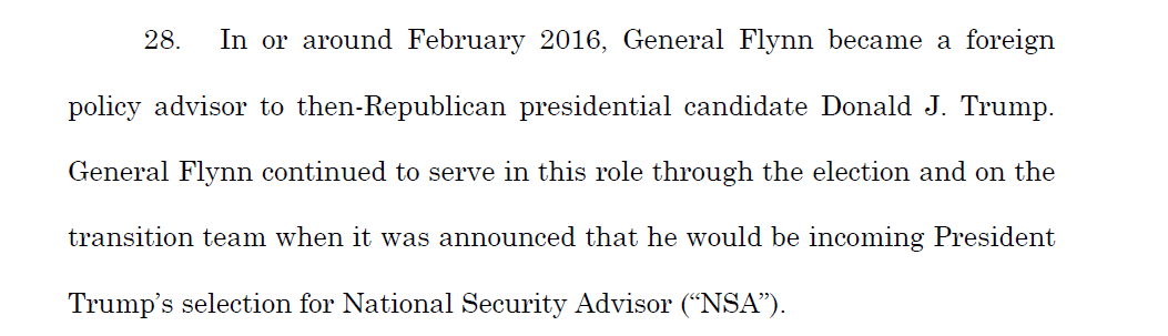 Many people don't know that General Flynn consulted for several 2016 candidates. In February of 2016, he became a foreign policy advisor to President Trump. He continued to serve in this role until it was announced he would be incoming President Trump's selection for NSA.