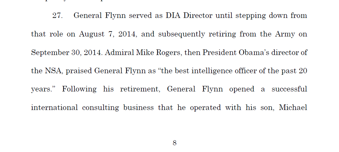 General Flynn served as DIA Director until he stepped down in August of 2014, and then returned from the Army on September 30, 2014. Admiral Rogers, director of the NSA, praised General Flynn as the "best intelligence officer of the past 20 years"