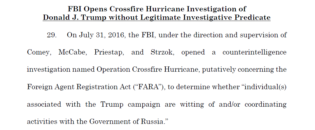 7/31/16: The FBI under Comey, McCabe, Priestap and Strzok open the CI investigation named "Crossfire Hurricane" assumed to concern FARA to determine whether "individuals associated with the Trump campaign are sitting of and/or coordinating activities with the Government of Russia"