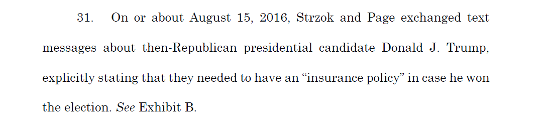 We can't forget the infamous August 15, 2016 "insurance policy" text messages between Strzok/Page .