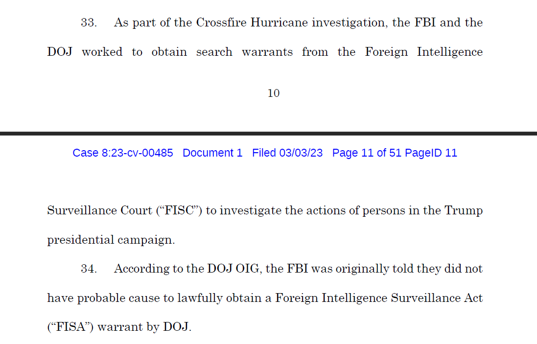 Crossfire Razor had no legitimate investigative predicate and was politically and maliciously initiated as part of the "insurance policy" referenced above. As part of this, they tried to get FISA warrants from the FISC. As per OIG, the FBI was originally told they didn't have probable cause for these warrants.