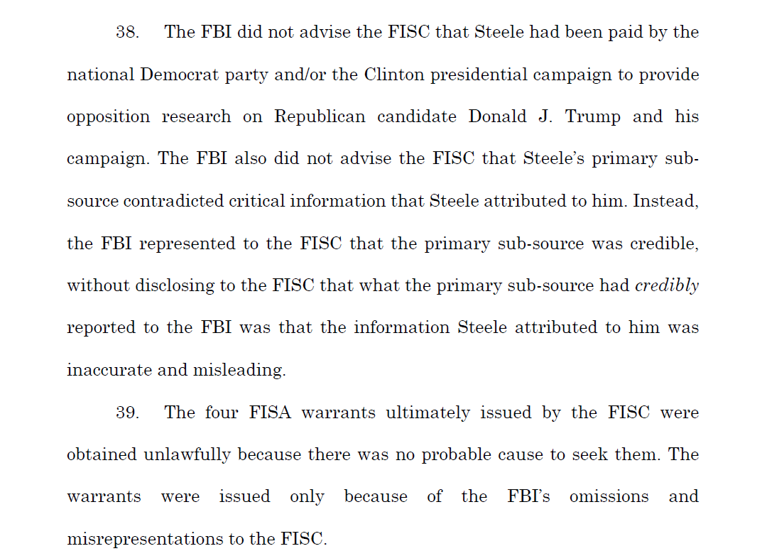 The FBI didn't tell the FISC that the evidence it has obtained was tainted oppo research that wasn't true. Instead, the FBI lied to the FISC to get the most intrusive warrant known to man to spy on the campaign.