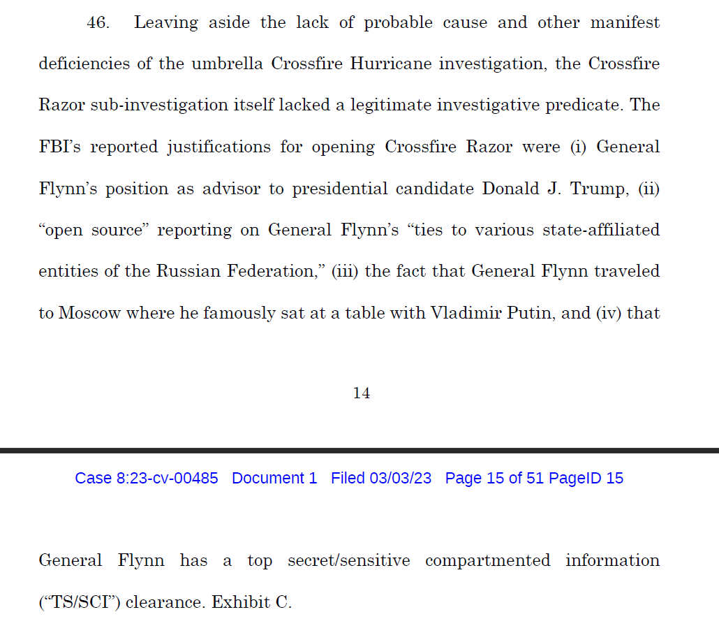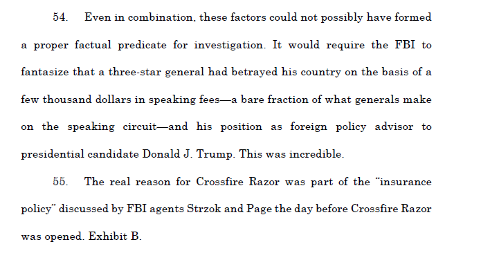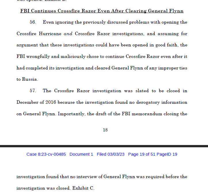 On 8/16/16, the FBI opened their investigation into General Flynn as a sub-part of the CH investigation. They called it "Crossfire Razor" and it was intended to determine if General Flynn knowingly or unknowingly was "involved in activity on behalf of the Russian Federation" which could be a crime of harm national security.