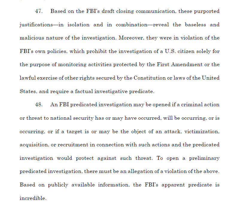 These purported justifications, taken alone or combined, reveal the baseless and malicious nature of the investigation and were in violation of the FBI's policies - which as Merrick Garland keeps telling you as they wage political war - prohibit investigation to monitor 1st amendment protected activities.