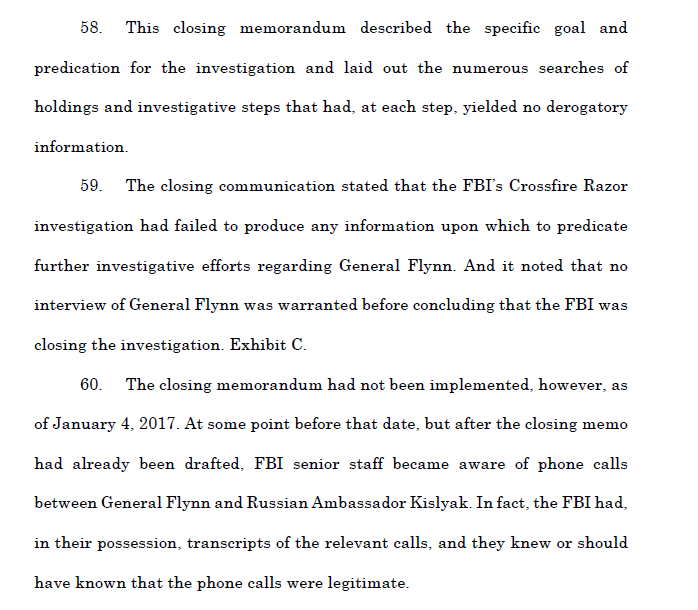 Flynn called Kislyak as part of his duties on the transition. The FBI had transcripts of those calls. They knew the calls were legitimate and proper.