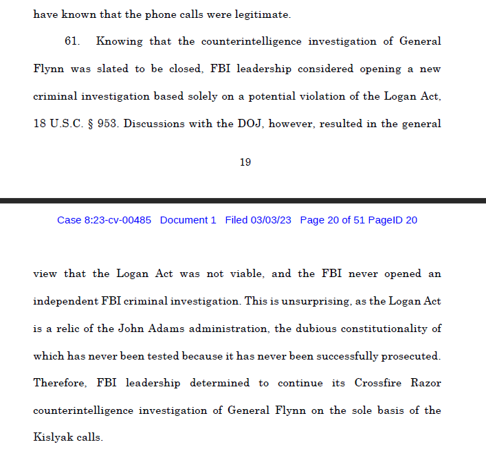 Knowing that the CI investigation was slated to be closed, they started considering opening a new criminal investigation based on the Logan Act. DOJ poo pooed the idea, and instead decided to keep the CI investigation open based solely on the calls to Kislyak,