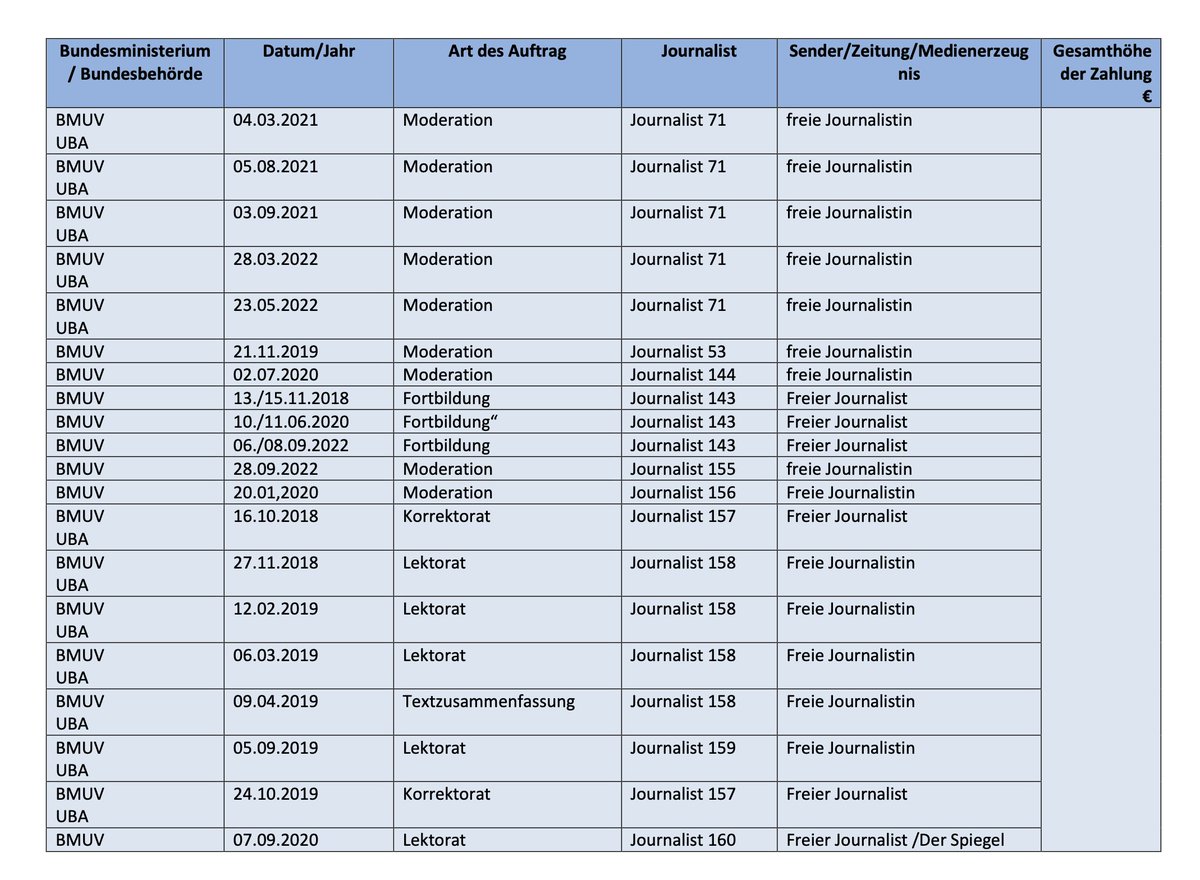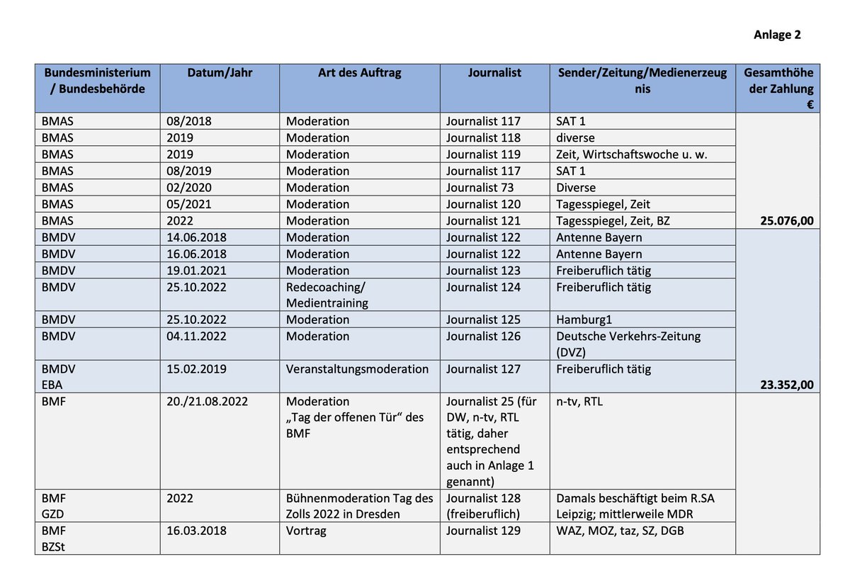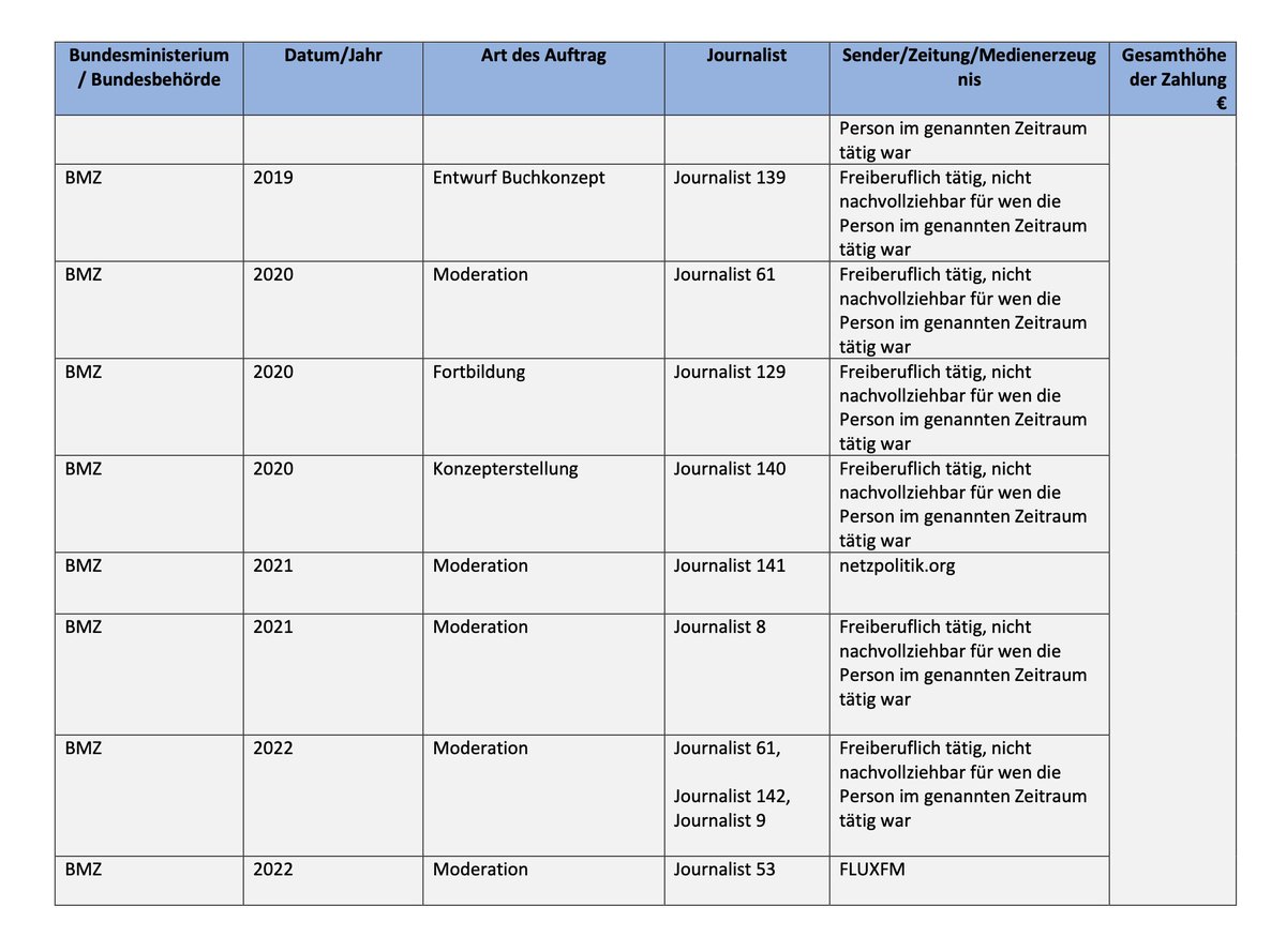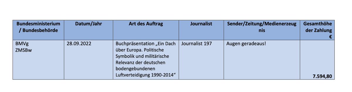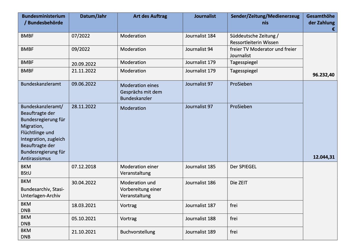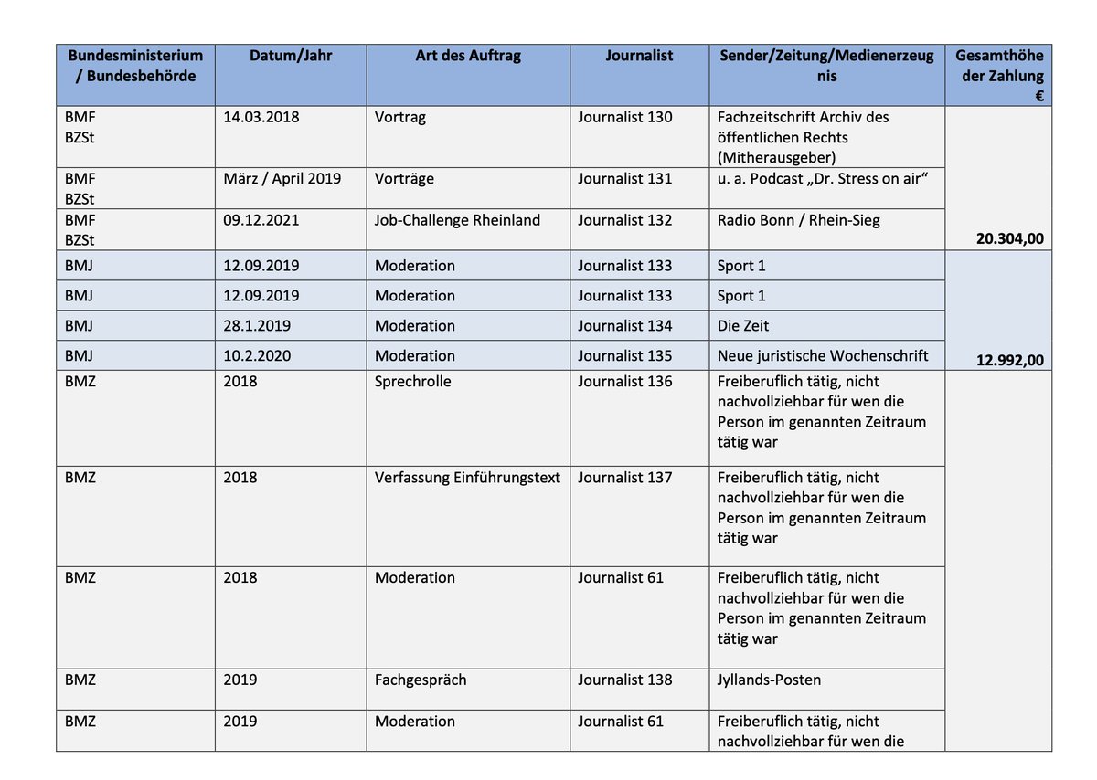 Spannende Antwort der Bundesregierung auf eine Anfrage zu "Zahlungen von Bundesministerien an Journalisten des öffentlich-rechtlichen Rundfunks und privatrechtlicher Medien". 200 Journalisten werden aufgeführt, Honorare im Schnitt oft 4.000/5.000€.