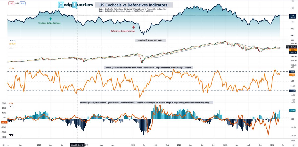 Cyclicals have now outperformed Defensives and #stocks have rallied in '23 with the prior deterioration trend in leading econ data neutralizing so far this year.