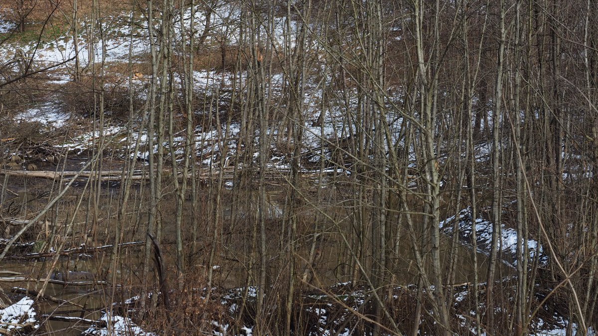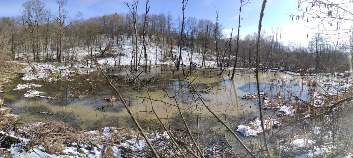Całość zaczyna się tutaj, gdzie szeroki na pół kroku i płytki do kostek leśny strumyczek napotyka solidną, rozpiętą między wzgórzami, długą na ok 30 metrów i wysoką jak człowiek tamę. Do powstałego w ten sposób Stawu Górnego (jak go sobie nazwałem) z okolicznych żerowisk... 2/12