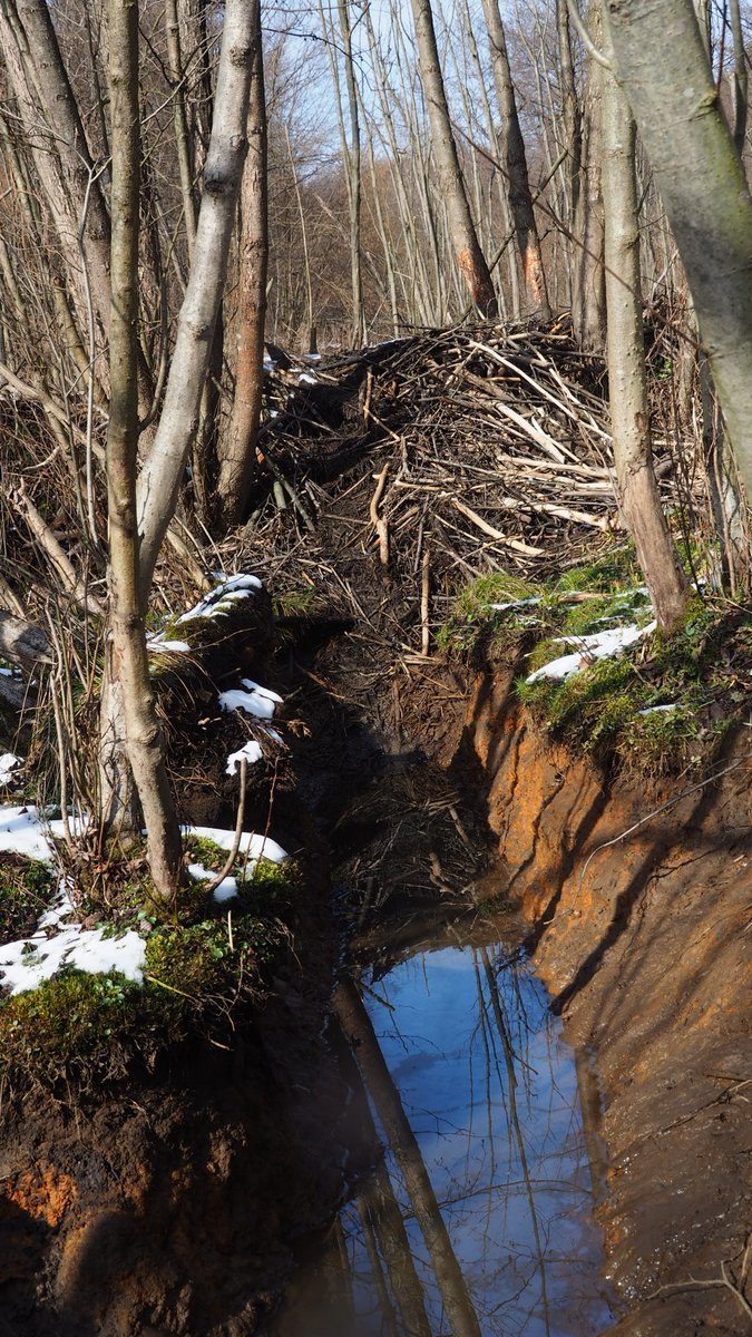Woda jest, ale widać, że trochę brakuje. Na ścieżkach dochodzących ze wzgórz można znaleźć idealnie ogryzione i pocięte kawałki drewna. Tutaj też, w samym sercu "miasta" - bobry w ukryciu wzniosły swój dwór - żeremia, które podziemnymi kanałami łączą się ze Stawem Środkowym 8/12