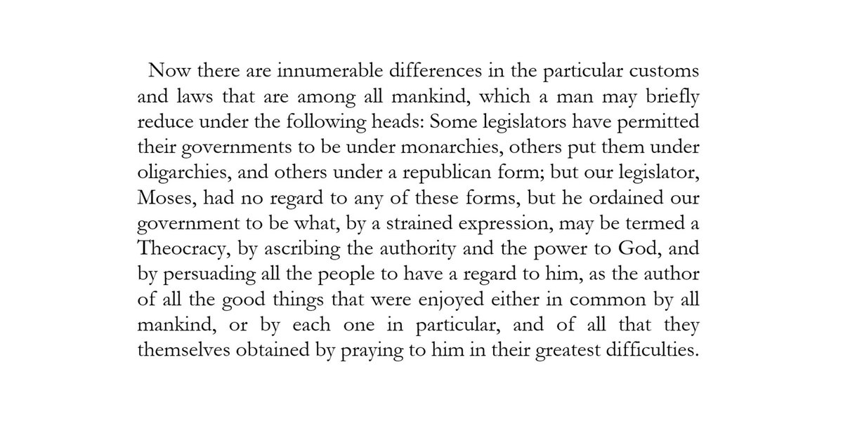 The historian Josephus argued that the Jewish people had a system with no precedent in the Graeco-Roman worldview: theocracy.