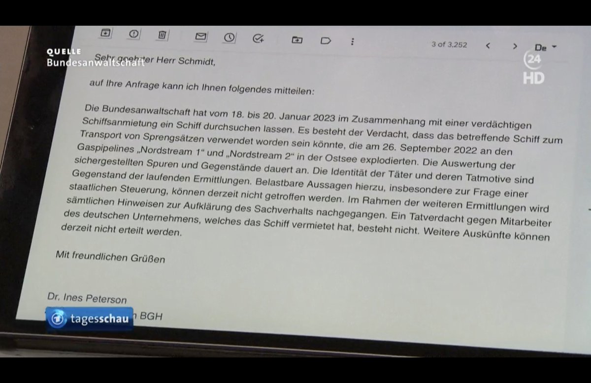 Screenshot of an email on German TV from a prosecutor. Note the underscoring of "German company that rented out the ship" and that the boat allegedly had explosive devices on it.