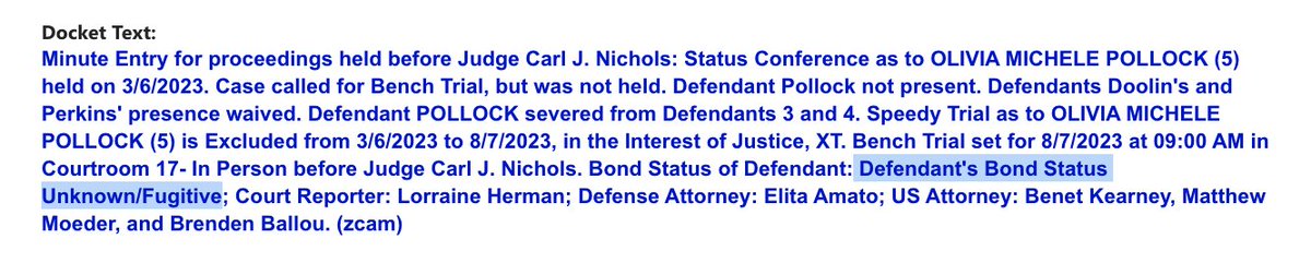 Jan. 6 defendant Olivia POLLOCK remains a fugitive, skipping the first day of what was supposed to be her jury trial today.