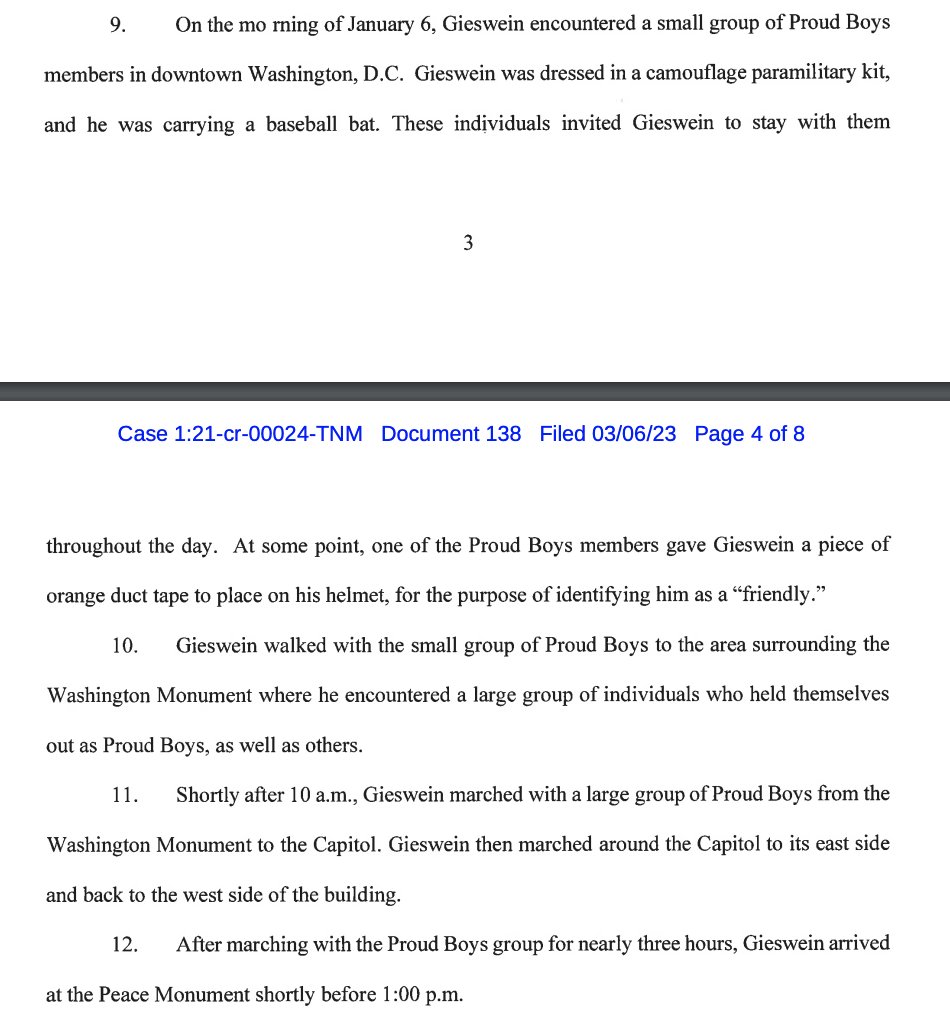 GIESWEIN's statement of offfense describes his march with the Proud Boys. Carmen Hernandes, defense attorney for Zach REHL noted this AM that he was invited to march by someone they understand to be a CHS. documentcloud.org/documents/2369…