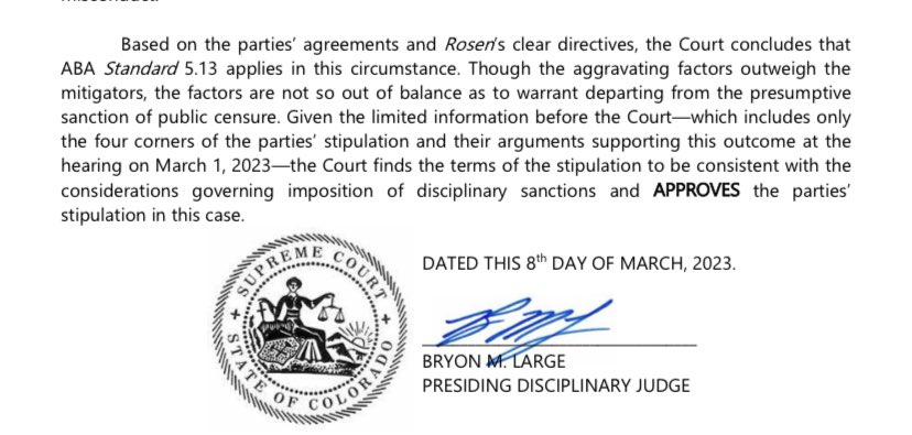 BUT: Because this is what the parties were willing to stipulate, the judge only had a “limited” set of facts to determine appropriate punishment and said it wasn’t enough to depart from “presumptive sanction” of public censure.