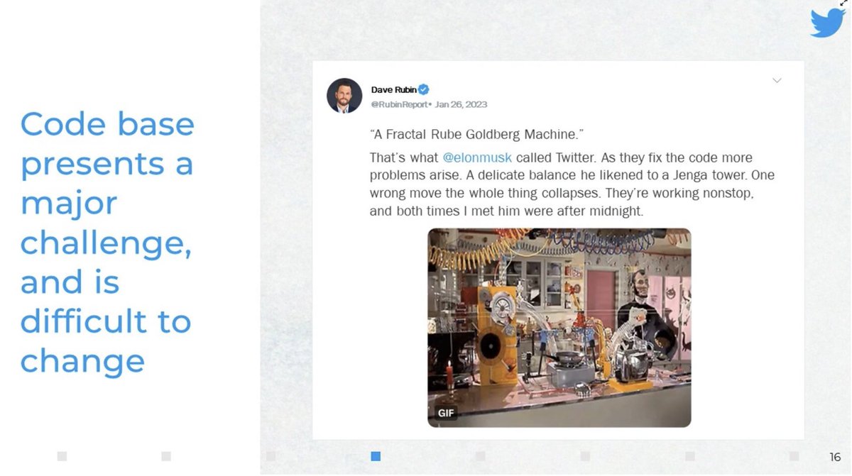 Elon calls Twitter a Fractal Rube Goldberg Machine. This lead to Twitter's outage yesterday, lead to suspended users to go on twitter spaces, Android users to unlike posts.