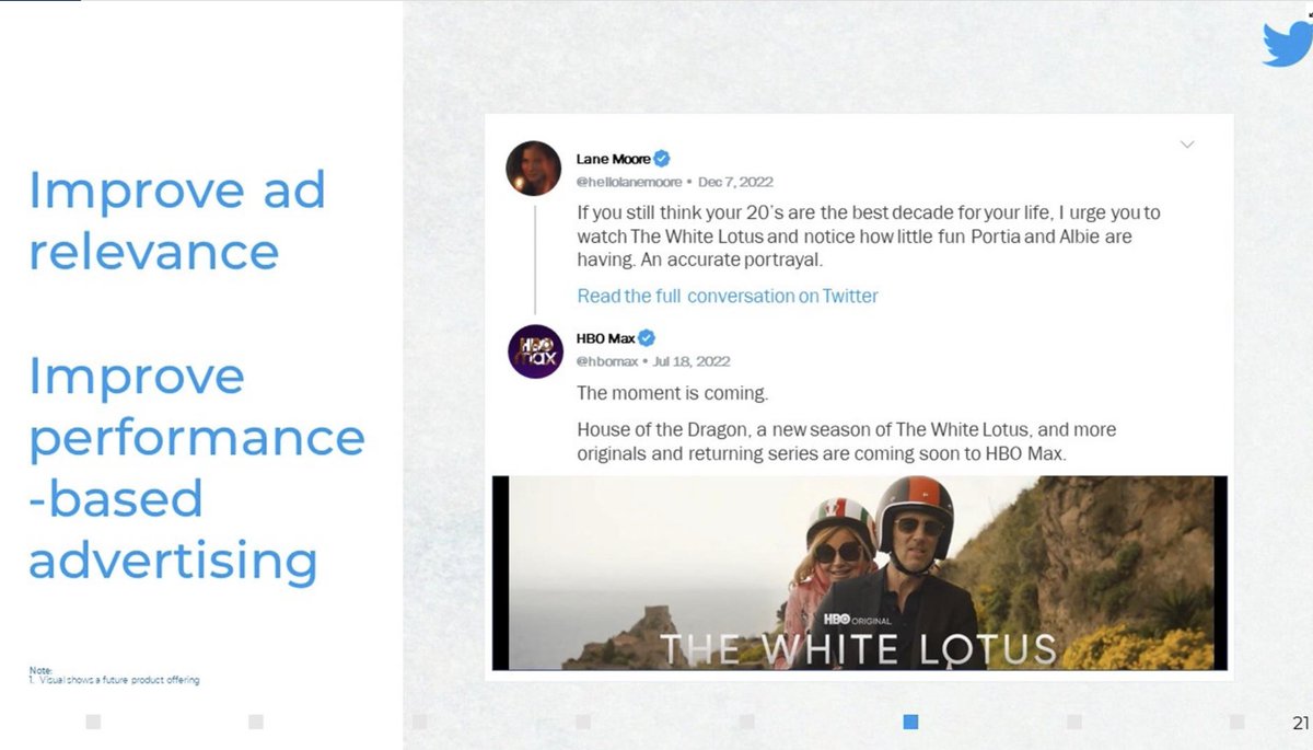 Twitter is focused in performance advertising. One of the examples is attaching a white lotus trailer when a user mentions white lotus.