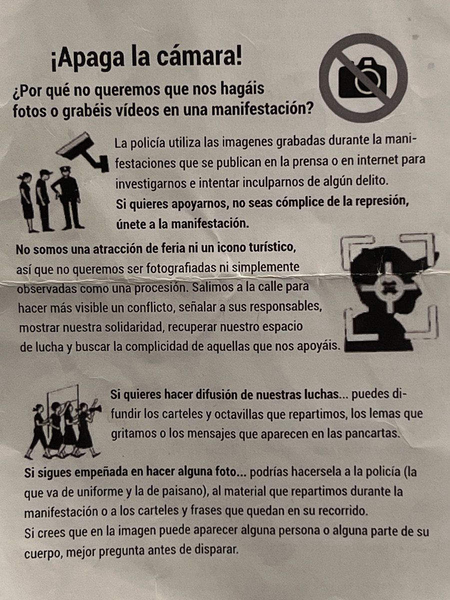 Adjunto uno de los papeles que han distribuido a los periodistas que cubrimos la manifestación en Barcelona prohibiendo el uso de la cámara en la calle, otros compañeros periodistas también han sido amenazados y agredidos verbalmente.