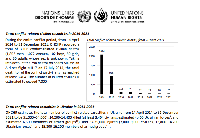 Durante todo el período del conflicto, desde el 14 de abril 2014 al 31 de diciembre de 2021, la @onu registró un total de 3.106 muertes de civiles relacionadas con el conflicto.