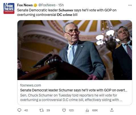 Today, we learned that Schumer (and many Democratic senators) will join Biden in an inexplicable, shameful, historic push to overturn the will of DC voters, who have no political representation in the Senate, all based on right-wing lies.