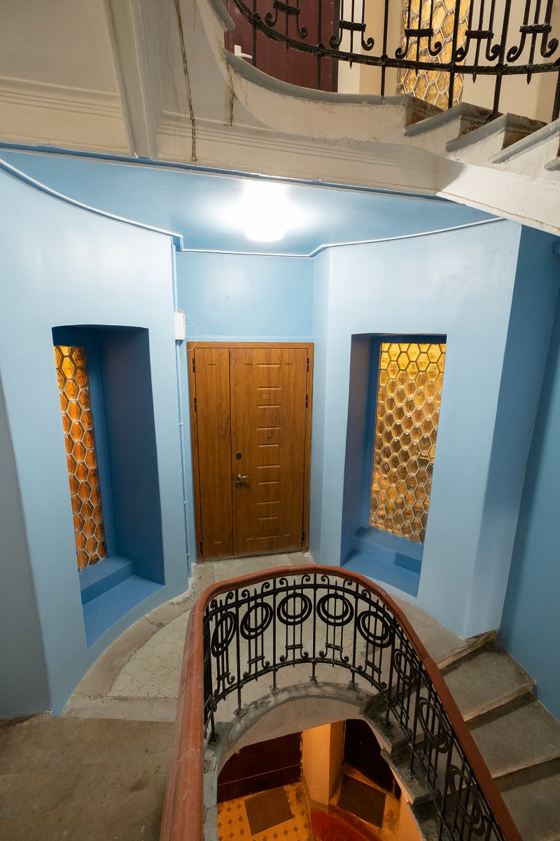 Доходный дом братьев Стуловых, где окна фальконье освещают парадную с обеих сторон и выходят на боковые черные лестницы. Недавно там была реставрация. Здание занимает администрация Пушкинского музея. Было время - лазали туда по строительным лесам на крышу, лихие времена.