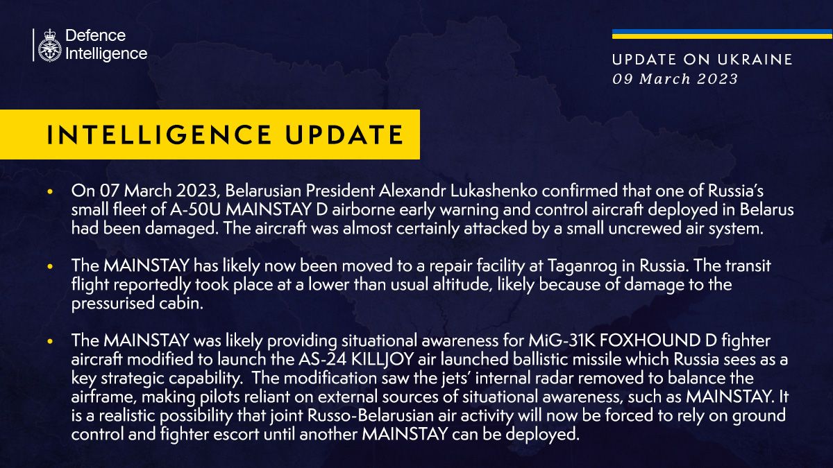 (1/6) On 07 March 2023, Belarusian President Alexandr Lukashenko confirmed that one of Russiaβs small fleet of A-50U MAINSTAY D airborne early warning and control aircraft deployed in Belarus had been damaged.